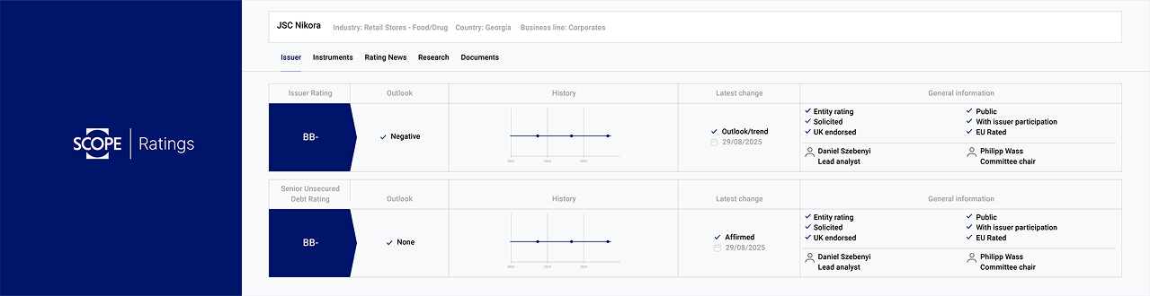 ჩვენი ამჟამინდელი რეიტინგი – BB- სტაბილური პერსპექტივით – უდრის ქვეყნის საკრედიტო შეფასებას და წარმოადგენს ყველაზე მაღალ მაჩვენებელს, რომელიც კომპანიას დღემდე ჰქონია. ეს შეფასება ხაზს უსვამს ჩვენს ფინანსურ მდგრადობას, ეფექტიან მენეჯმენტსა და გრძელვადიან სტრატეგიულ განვითარებას. რეიტინგის პოზიტიური დინამიკა ზრდის ნდობას ინვესტორთა და ფინანსური ინსტიტუტების მხრიდან.